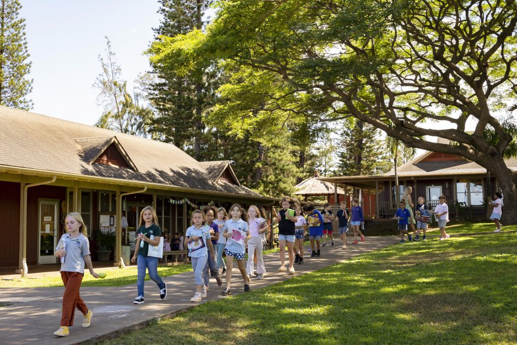Maui Preparatory Academy students walk back to the classroom after a book fair on Tuesday, Oct. 3, 2023, in Lahaina, Hawaii. At one point the academy had taken in about 150 public school students. The three public schools that survived the deadly August wildfire are set to reopen this week.