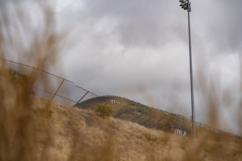 The "L" symbol stands for Lahainaluna High School on Tuesday, Oct. 3, 2023, in Lahaina, Hawaii. Lahainaluna High School and two other public schools in Lahaina that survived August's wildfire will reopen this week.