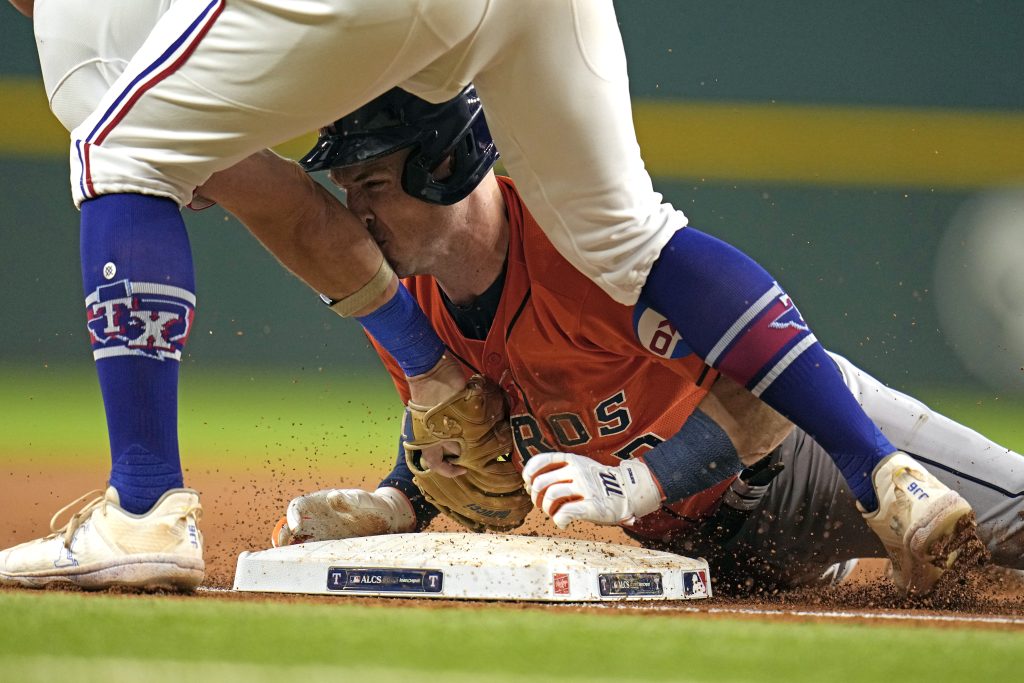 The Rangers were still down 7-3, but had two on with no outs in the fifth when a finger of Marcus Semien鈥檚 batting glove was the difference between a lineout and a crucial double play. The Rangers baserunner was sliding back to first base after Abreu snagged Seager鈥檚 108.6 mph liner, lunging to tag Semien just as his hand reached the bag, and first base umpire Jordan Baker signaled safe. The Astros challenged and the call was overturned.