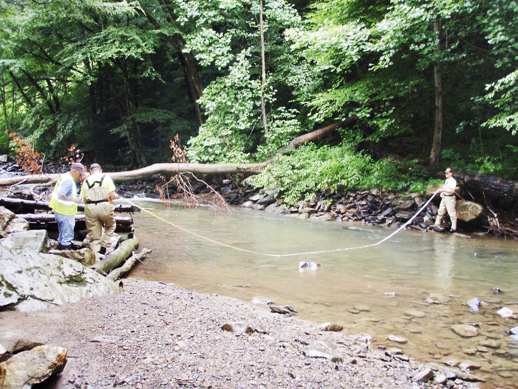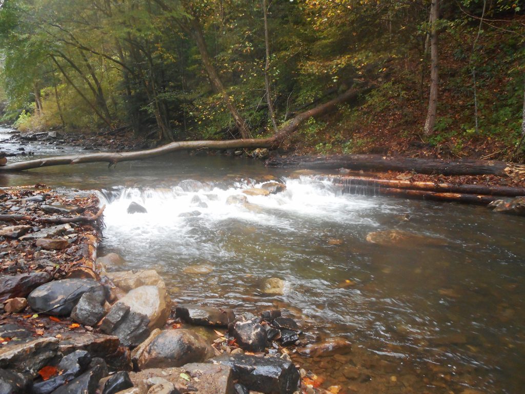 After the 2014 flood, the stream span formerly impounded by a jack-dam flowed shallow and featureless, offering no refuge for trout and no cover for aquatic insects. Some Dunbar Creek fishermen wanted the dams rebuilt, others advocated open flow that permitted fish migration. Early in 2018 the Chestnut Ridge Chapter of Trout Unlimited initiated a compromise where the remains of the best-known jack-dam still jutted from the creek near the end of Betty Knox Road. Chapter representatives consulted Jose Taracido, director of the Partners for Fish and Wildlife Program based at California University of Pennsylvania. Partners for Fish and Wildlife is a collaboration of university, government, and private resources that implements “on-the-ground” conservation projects across Western Pennsylvania, with guidance from the U.S. Fish and Wildlife Service. Taracido recommended placing an innovative design called a “cross-vane” in Dunbar Creek where the former jack-dam had impounded the flow.