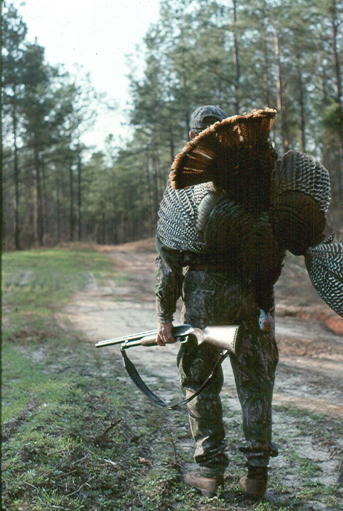 We climbed up there, set up just below the ridgeline, somewhat out of the wind, and began calling. My heart wasn’t in the hunt because I thought there was no way a turkey could hear our yelps and putts in that gale, but Aaron wouldn’t give up. Suddenly, that turkey he’d heard the night before gobbled just over the crest of the ridge. It would stay silent for a while, then gobble from farther away and we’d have to coax it back. Finally, the gobbler stepped within Aaron’s range. I couldn’t see the bird at that point, but I could see Aaron nestle the gun on his knee and sight down the barrel. It seemed to take a long time for him to shoot but finally the gun boomed. Aaron was so calm and reserved that I thought he’d missed. Eventually he got up, walked a few yards to the crest, picked up his gobbler and grinned.