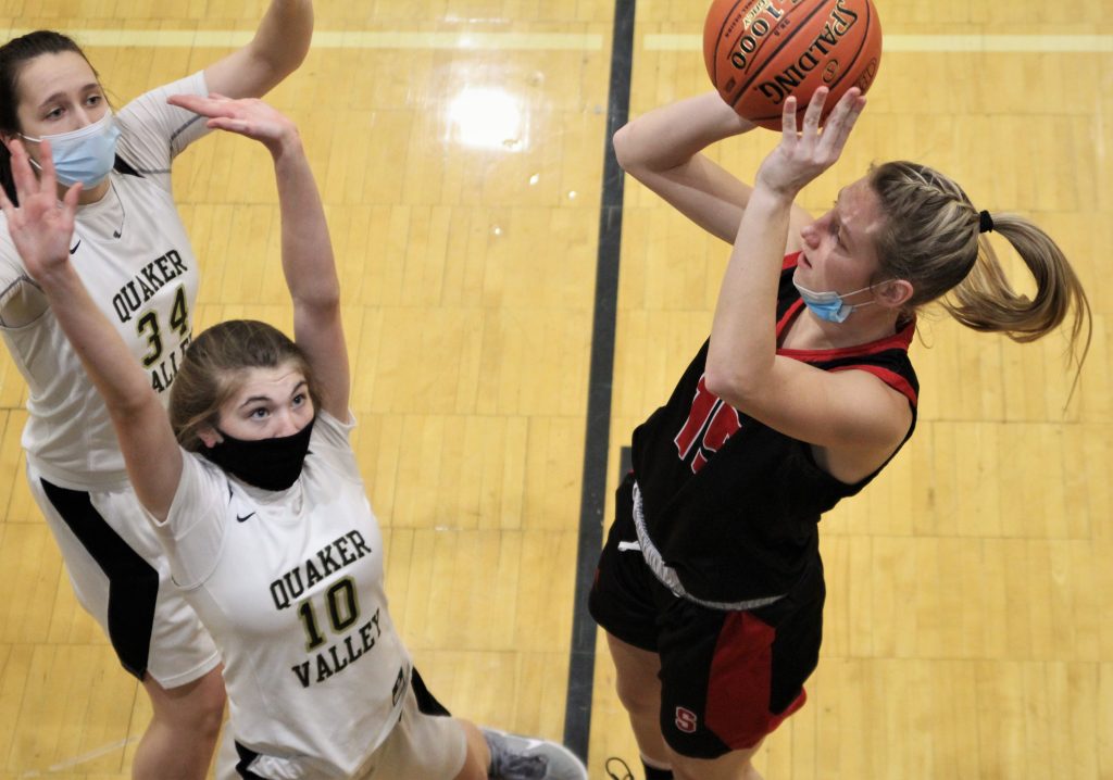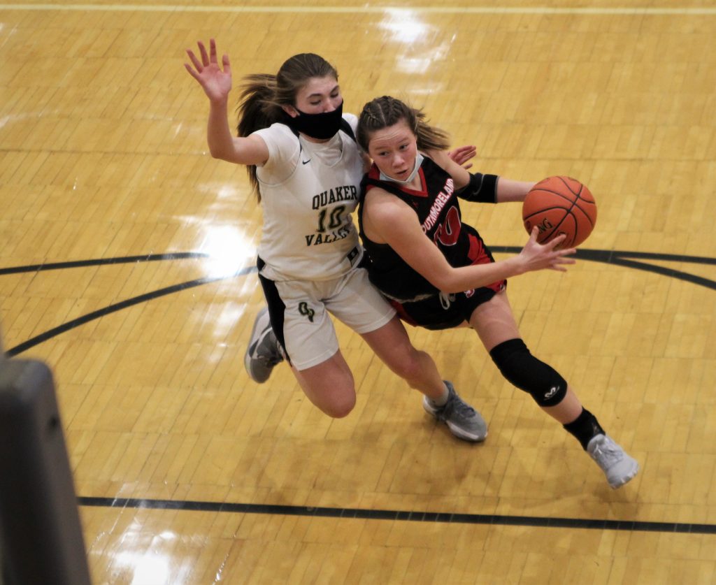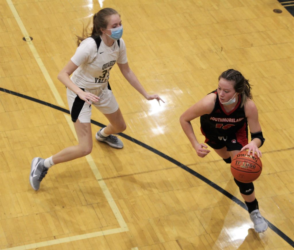 Southmoreland held the ball for the last shot of the first half, but Spadaro had her shot blocked and Quaker Valley made the most of the defensive play with Nora Johns scoring a layup before the buzzer for a 33-20 halftime lead.